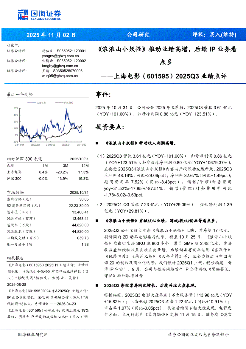 上海电影:国海证券-上海电影-601595-2025Q3业绩点评:《浪浪山小妖怪》推动业绩高增,后续IP业务看点多-251102