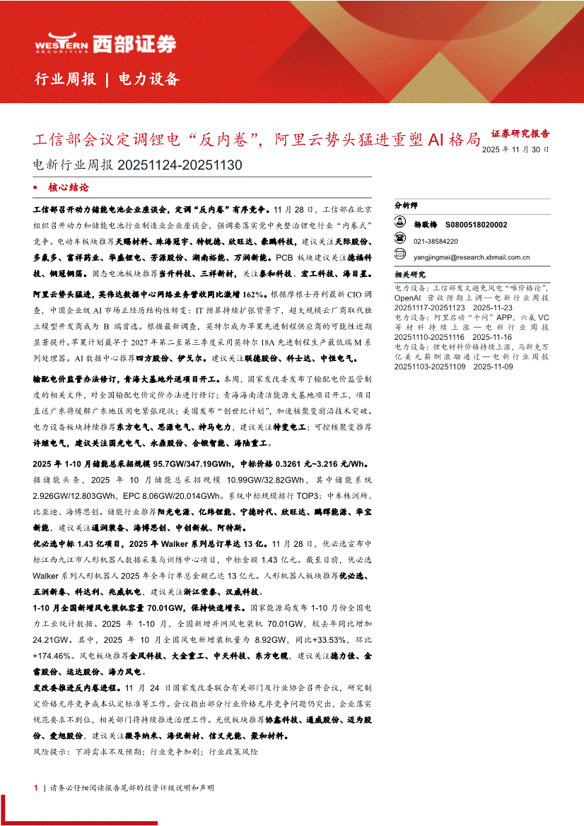 电新行业:西部证券-电新行业周报:工信部会议定调锂电“反内卷”,阿里云势头猛进重塑AI格局-251130