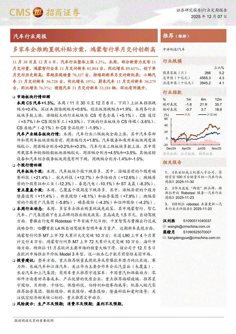 汽车行业:招商证券-汽车行业周报:多家车企推购置税补贴方案,鸿蒙智行单月交付创新高-251207