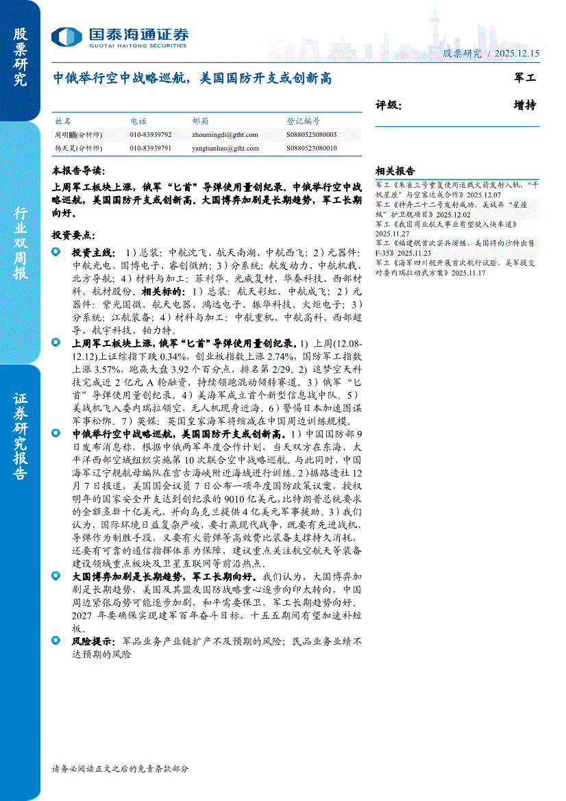 军工行业:国泰海通证券-军工行业:中俄举行空中战略巡航,美国国防开支或创新高-251215