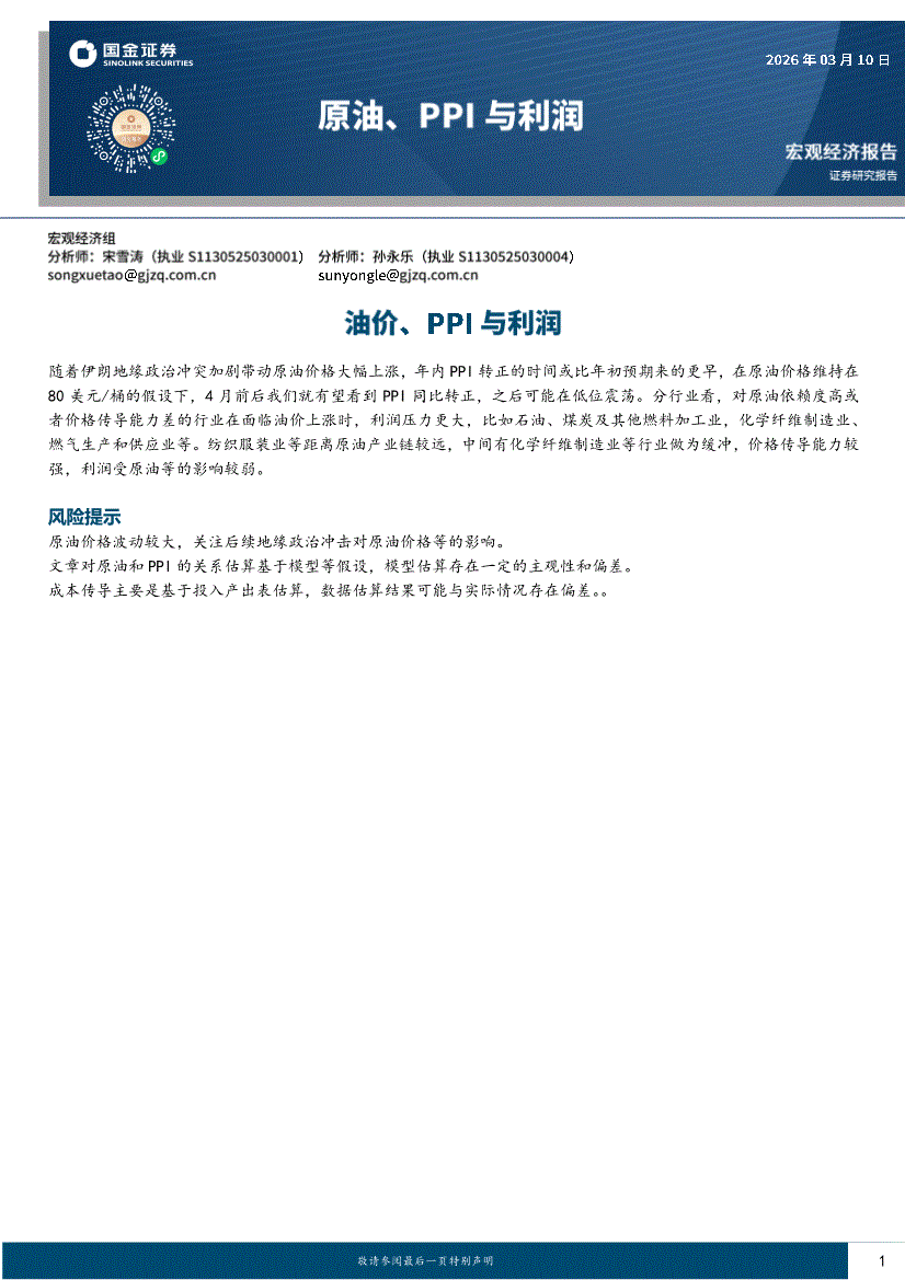 国金证券-原油、PPI与利润:油价、PPI与利润-260310
