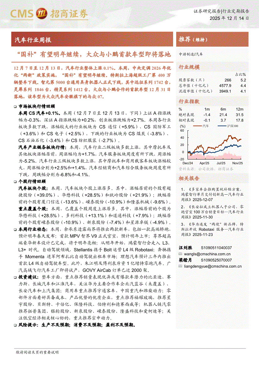 汽车行业:招商证券-汽车行业周报:“国补”有望明年继续,大众与小鹏首款车型即将落地-251214