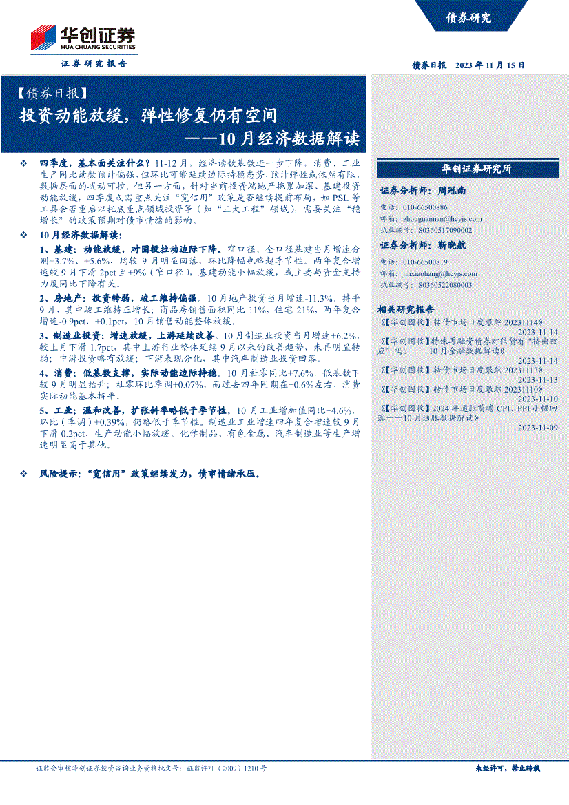 华创证券-10月经济数据解读:投资动能放缓,弹性修复仍有空间-231115