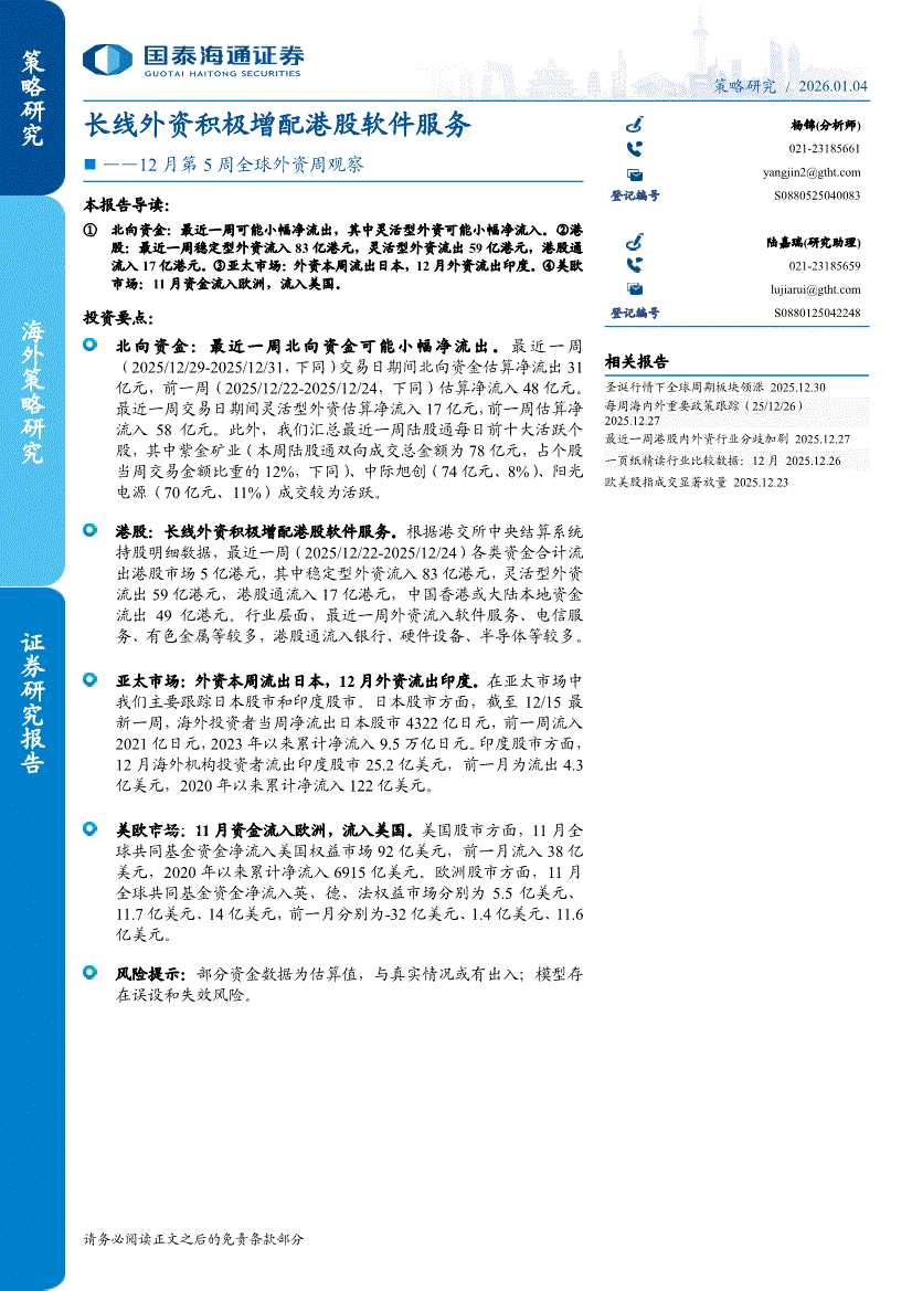 国泰海通证券-12月第5周全球外资周观察:长线外资积极增配港股软件服务-260104