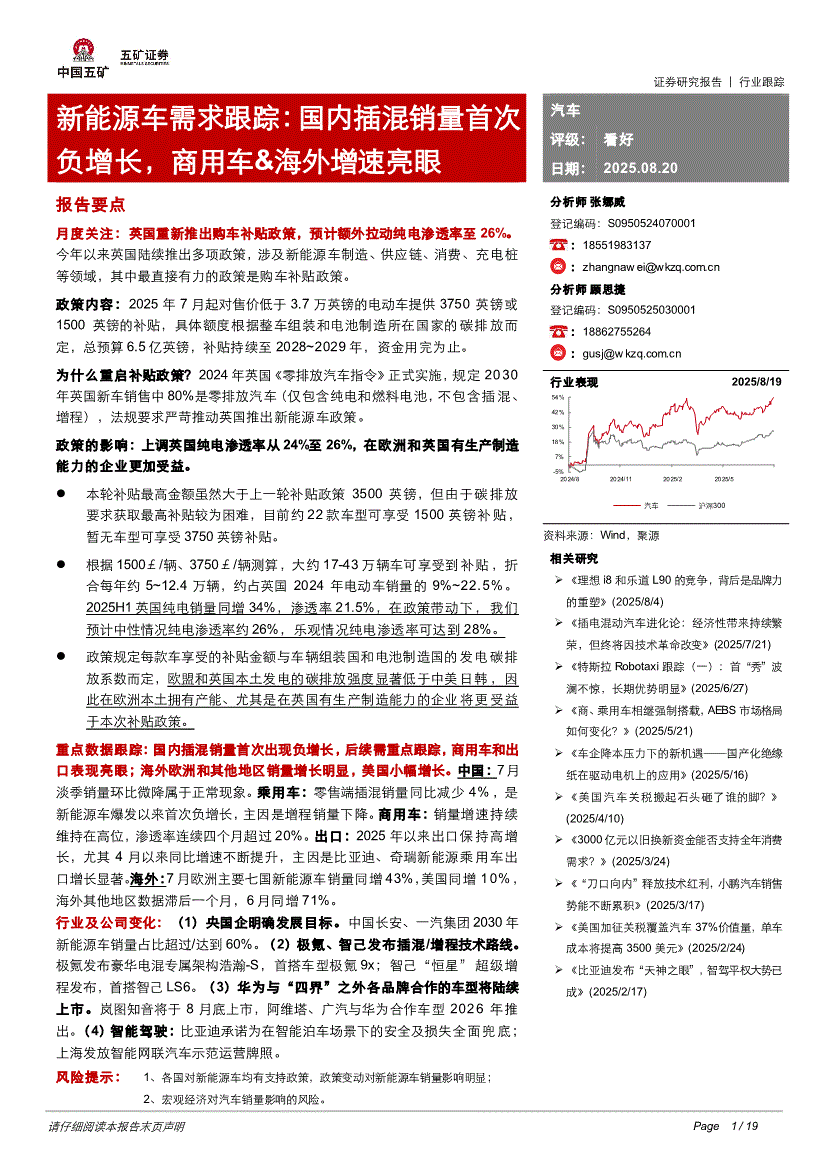 新能源车行业:五矿证券-新能源车行业需求跟踪:国内插混销量首次负增长,商用车&海外增速亮眼-250820