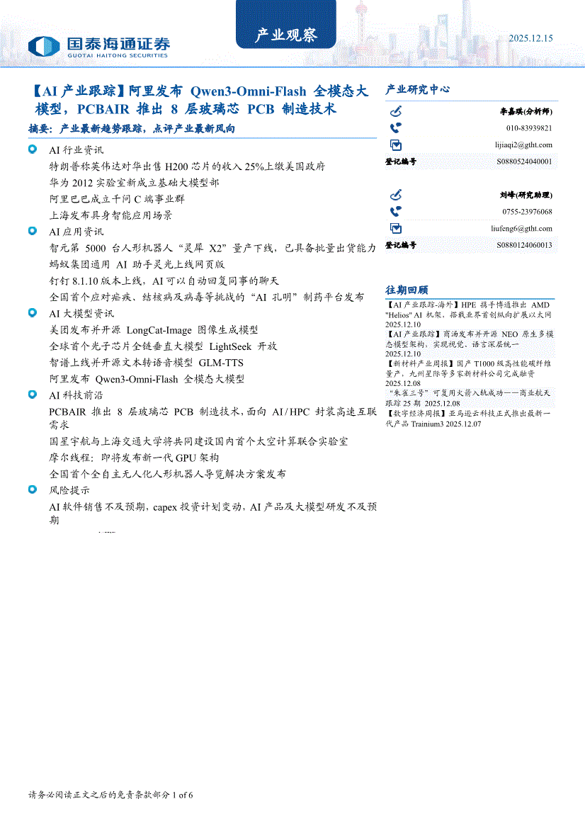 国泰海通证券-产业观察:【AI产业跟踪】阿里发布Qwen3~Omni~Flash全模态大模型,PCBAIR推出8层玻璃芯PCB制造技术-251215