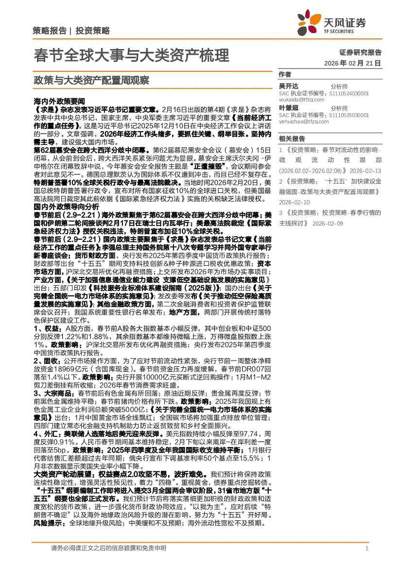 天风证券-政策与大类资产配置周观察:春节全球大事与大类资产梳理-260221