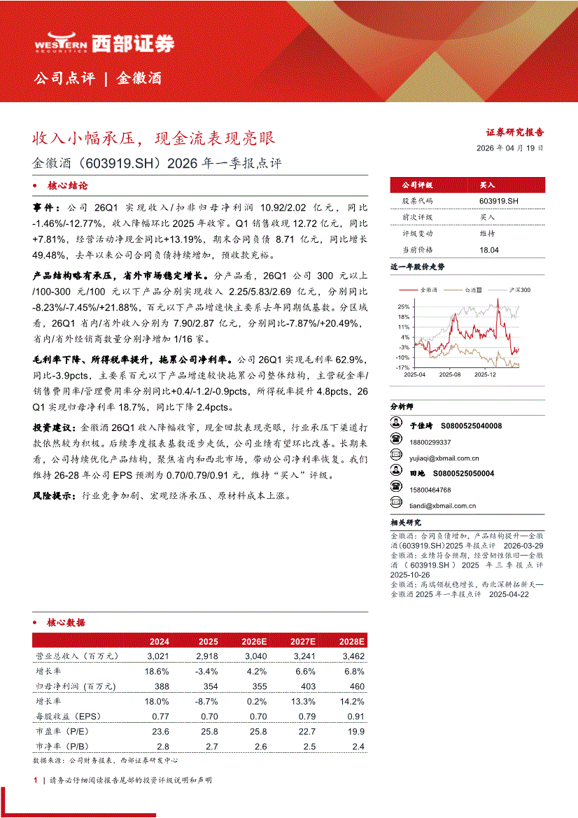 金徽酒:西部证券-金徽酒-603919-2026年一季报点评:收入小幅承压,现金流表现亮眼-260419