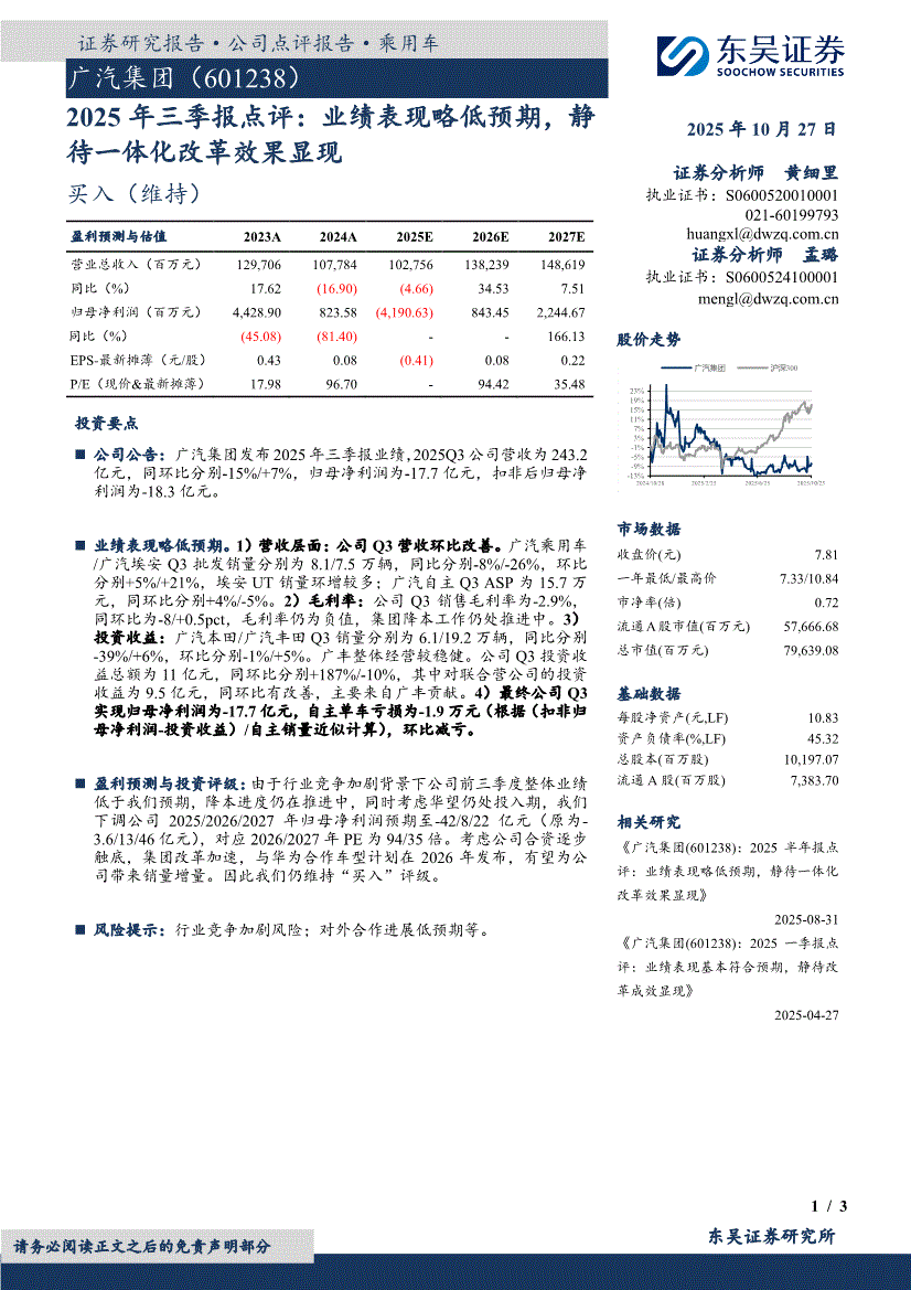 广汽集团:东吴证券-广汽集团-601238-2025年三季报点评:业绩表现略低预期,静待一体化改革效果显现-251027