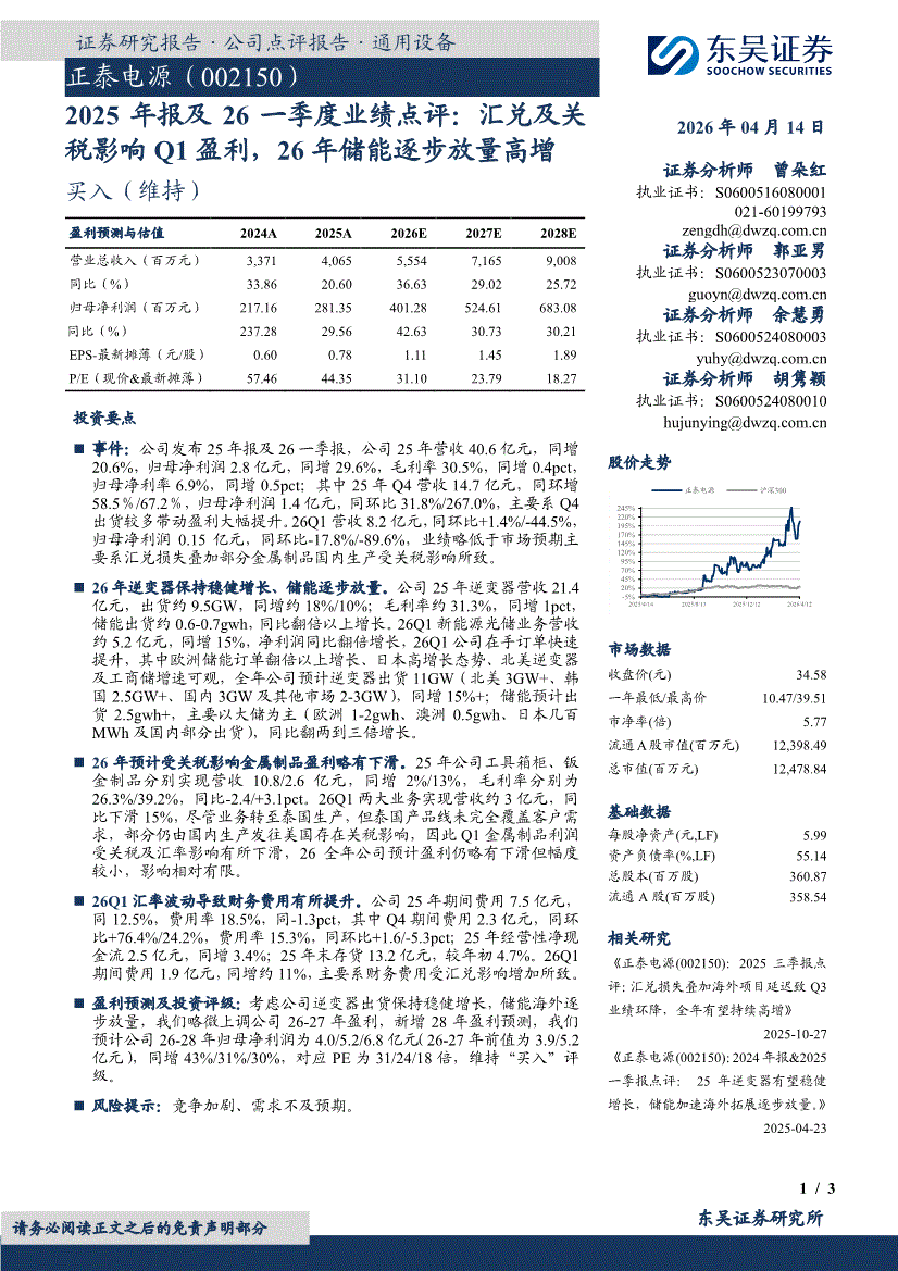 正泰电源:东吴证券-正泰电源-002150-2025年报及26一季度业绩点评:汇兑及关税影响Q1盈利,26年储能逐步放量高增-260414