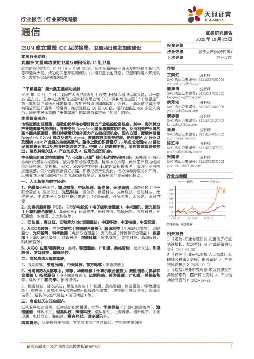 通信行业:天风证券-通信行业研究周报:ESUN成立重塑IDC互联格局,卫星两日连发加速建设-251022