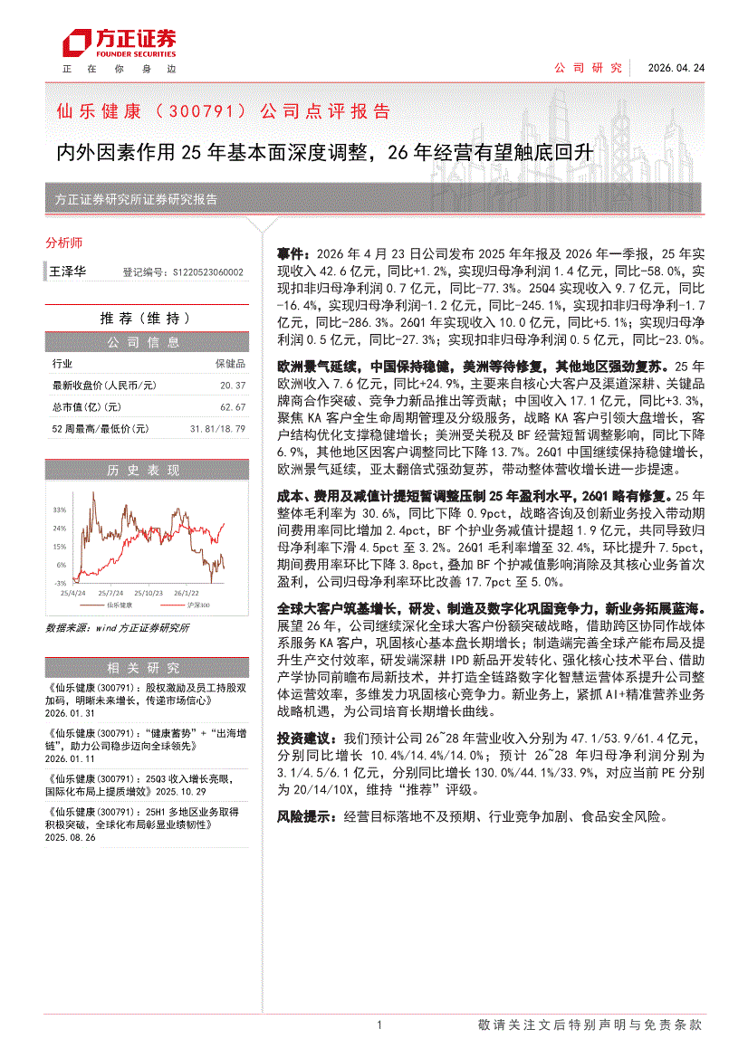 仙乐健康:方正证券-仙乐健康-300791-公司点评报告:内外因素作用25年基本面深度调整,26年经营有望触底回升-260424