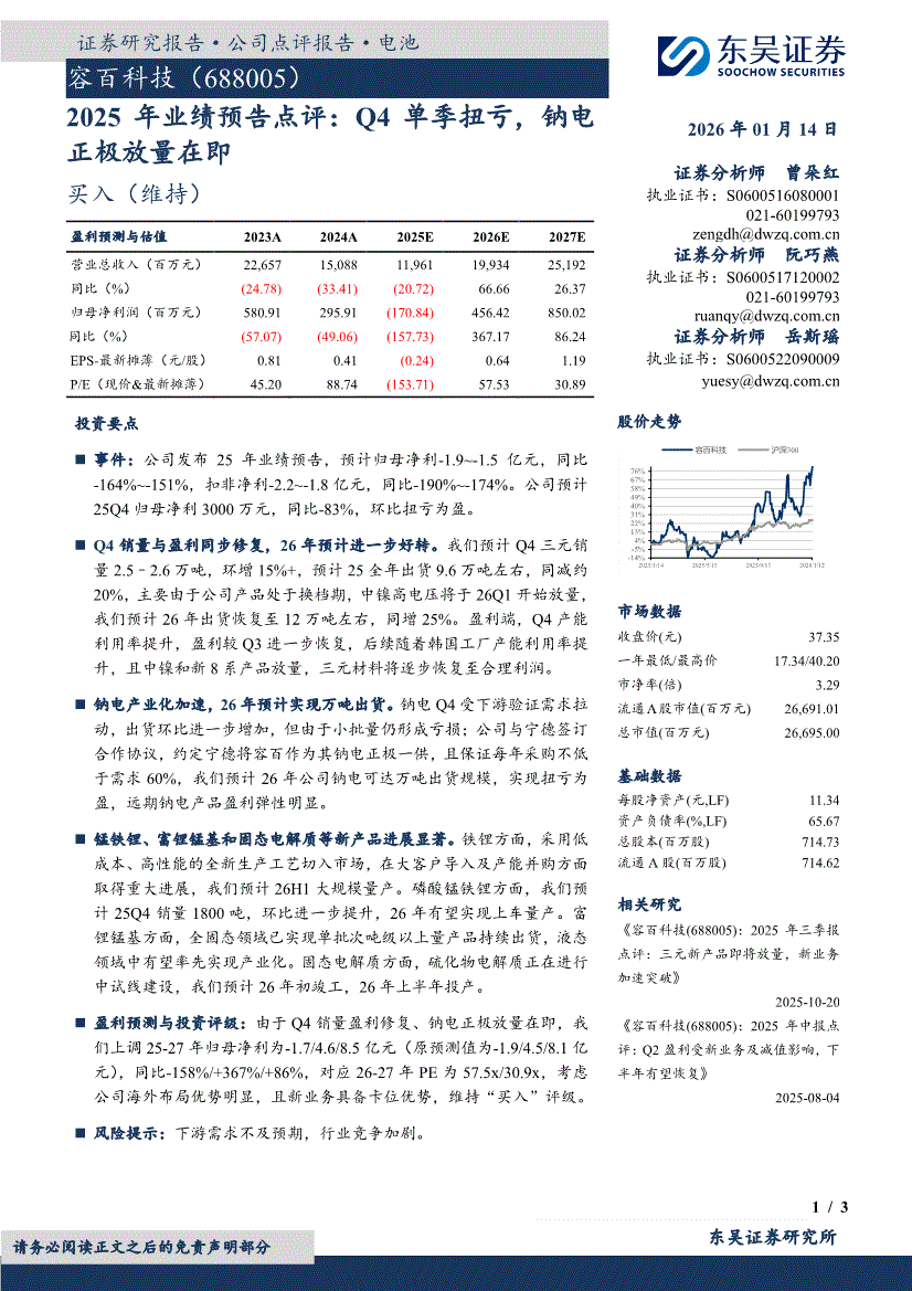 容百科技:东吴证券-容百科技-688005-2025年业绩预告点评:Q4单季扭亏,钠电正极放量在即-260114