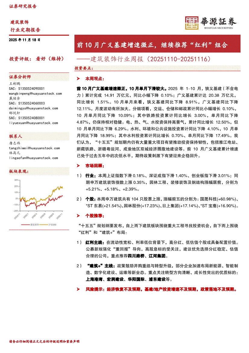 建筑装饰行业:华源证券-建筑装饰行业周报:前10月广义基建增速微正,继续推荐“红利”组合-251118