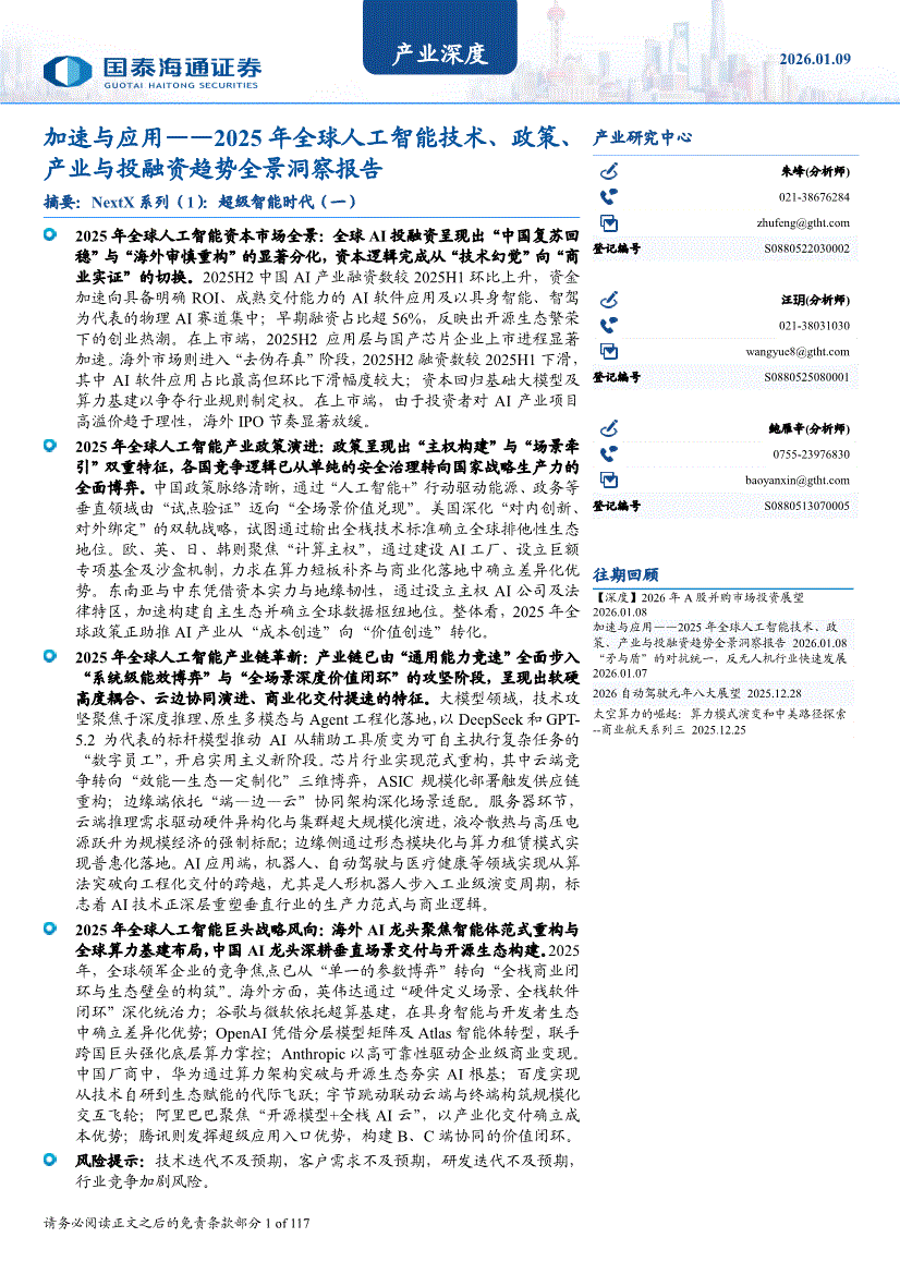 国泰海通证券-产业深度:加速与应用——2025年全球人工智能技术、政策、产业与投融资趋势全景洞察报告-260109