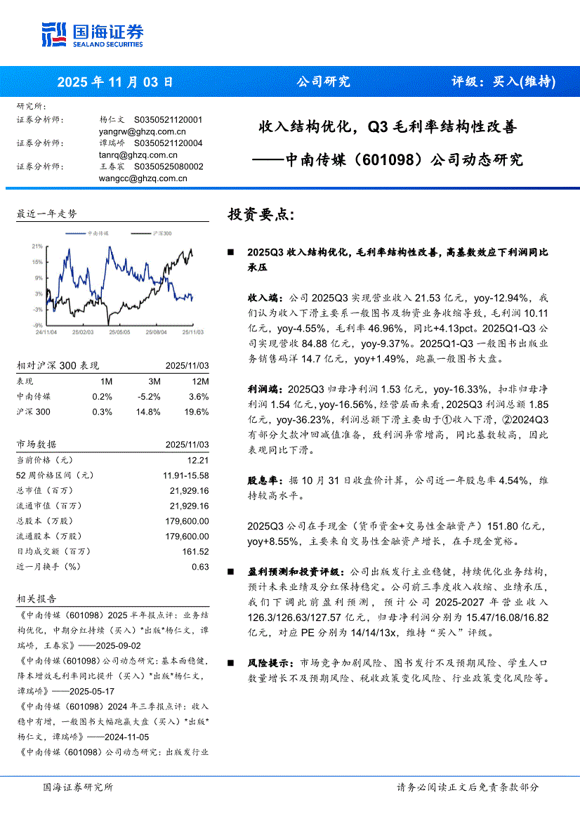 中南传媒:国海证券-中南传媒-601098-公司动态研究:收入结构优化,Q3毛利率结构性改善-251103
