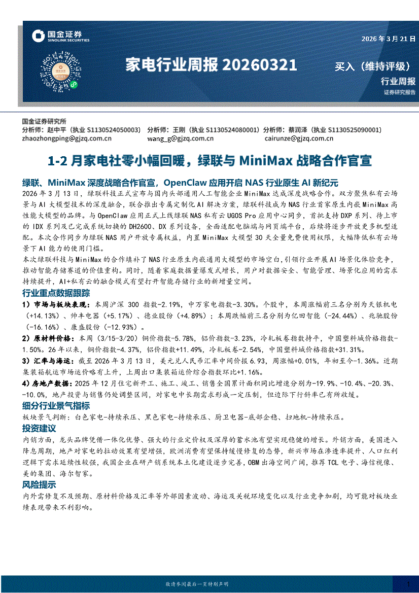 家电行业:国金证券-家电行业周报:1~2月家电社零小幅回暖,绿联与MiniMax战略合作官宣-260321