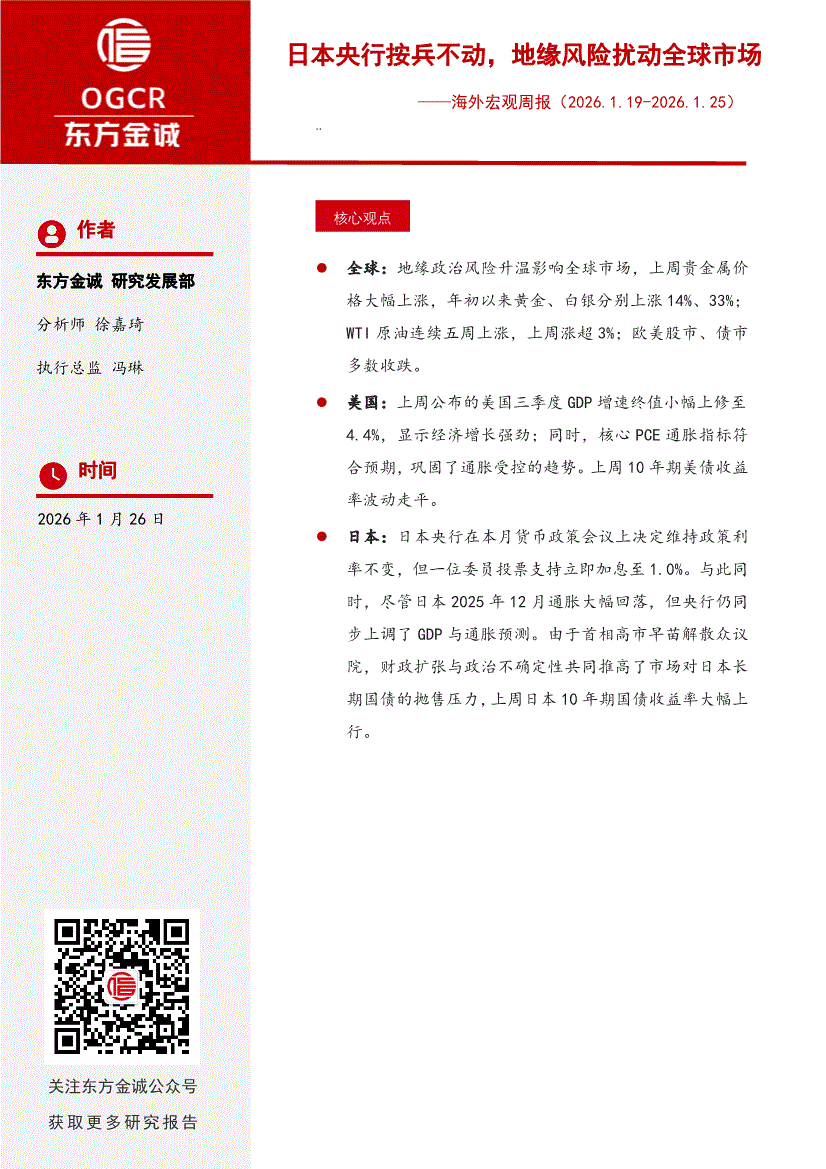 东方金诚-海外宏观周报:日本央行按兵不动,地缘风险扰动全球市场-260126