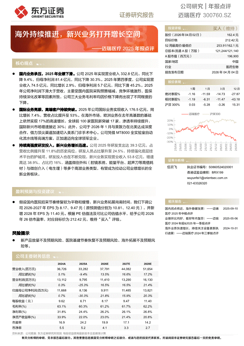 迈瑞医疗:东方证券-迈瑞医疗-300760-2025年报点评:海外持续推进,新兴业务打开增长空间-260404