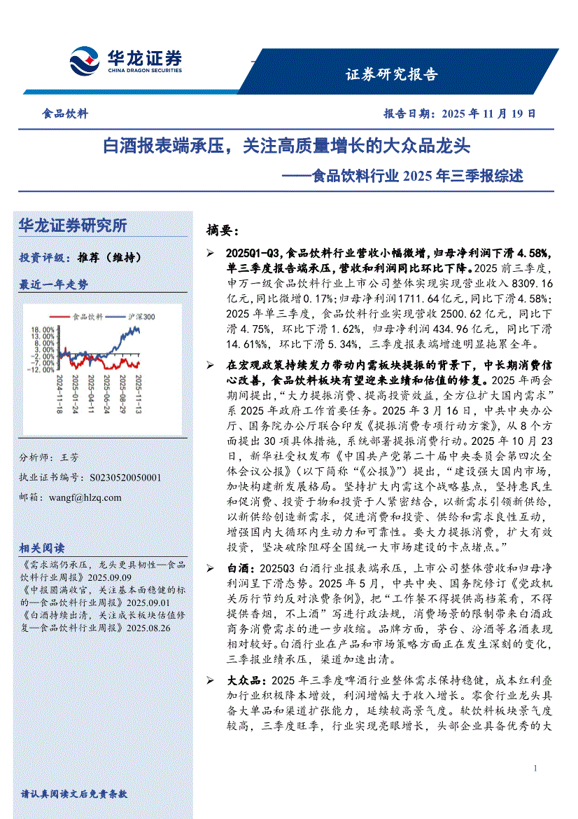 食品饮料行业:华龙证券-食品饮料行业2025年三季报综述:白酒报表端承压,关注高质量增长的大众品龙头-251119