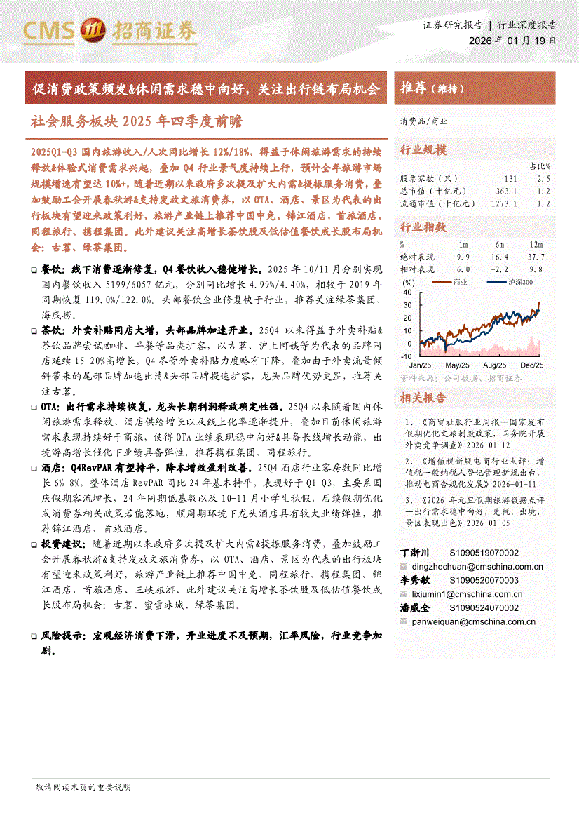 社会服务行业:招商证券-社会服务行业板块2025年四季度前瞻:促消费政策频发&休闲需求稳中向好,关注出行链布局机会-260119