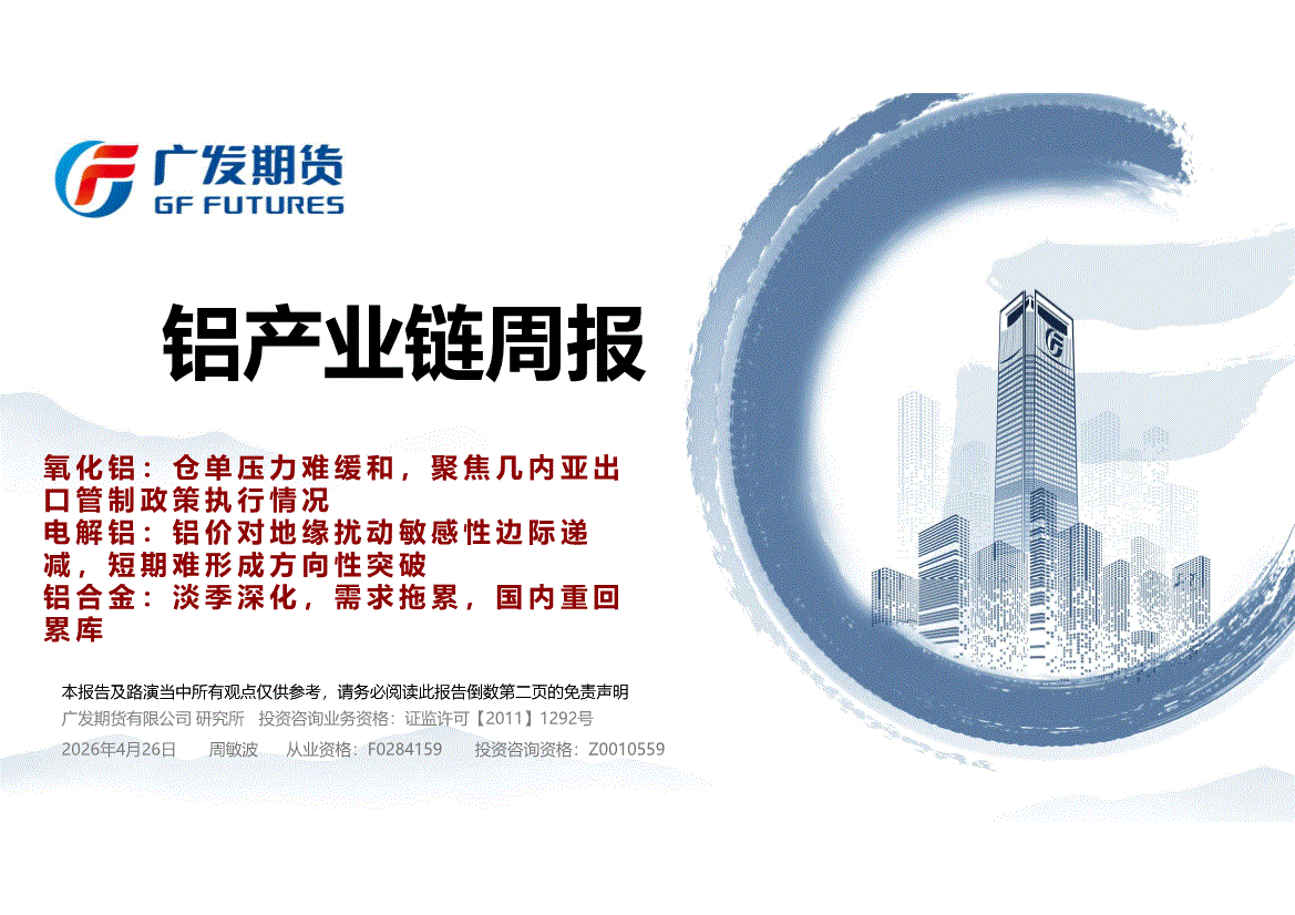 广发期货-铝产业链周报:氧化铝,仓单压力难缓和,聚焦几内亚出口管制政策执行情况,电解铝,铝价对地缘扰动敏感性边际递减,短期难形成方向性突破,铝合金,淡季深化,需求拖累,国内重回累库-260426