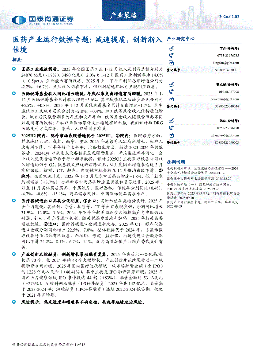 国泰海通证券-产业策略:医药产业运行数据专题,减速提质,创新渐入佳境-260203