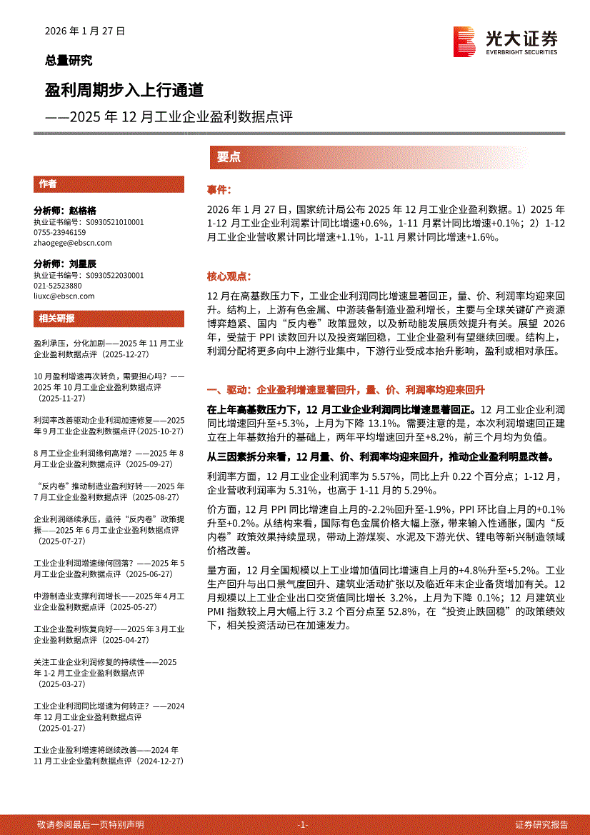光大证券-2025年12月工业企业盈利数据点评:盈利周期步入上行通道-260127