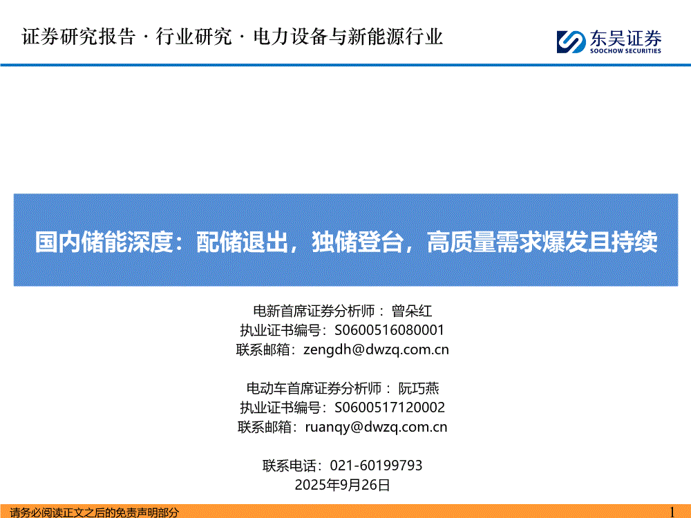 电力设备与新能源行业:东吴证券-电力设备与新能源行业:国内储能深度,配储退出,独储登台,高质量需求爆发且持续-250926