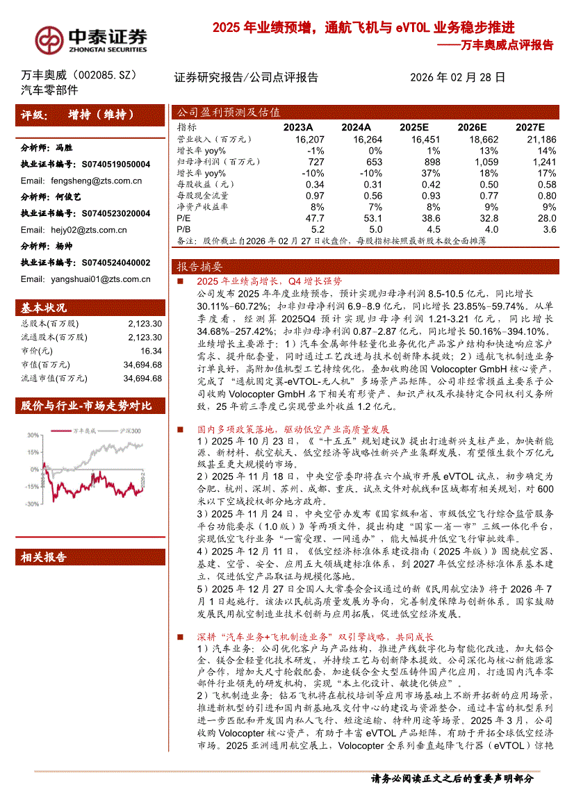 万丰奥威:中泰证券-万丰奥威-002085-点评报告:2025年业绩预增,通航飞机与eVTOL业务稳步推进-260228