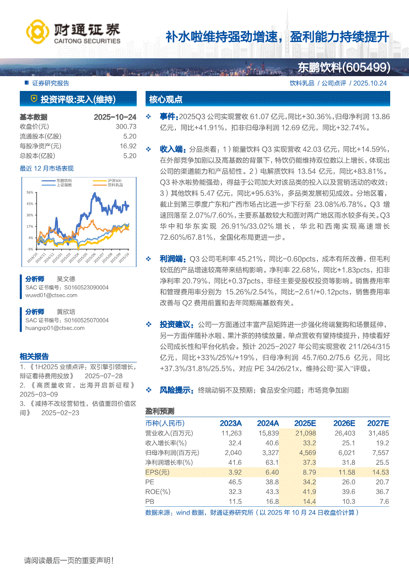 东鹏饮料:财通证券-东鹏饮料-605499-补水啦维持强劲增速,盈利能力持续提升-251024