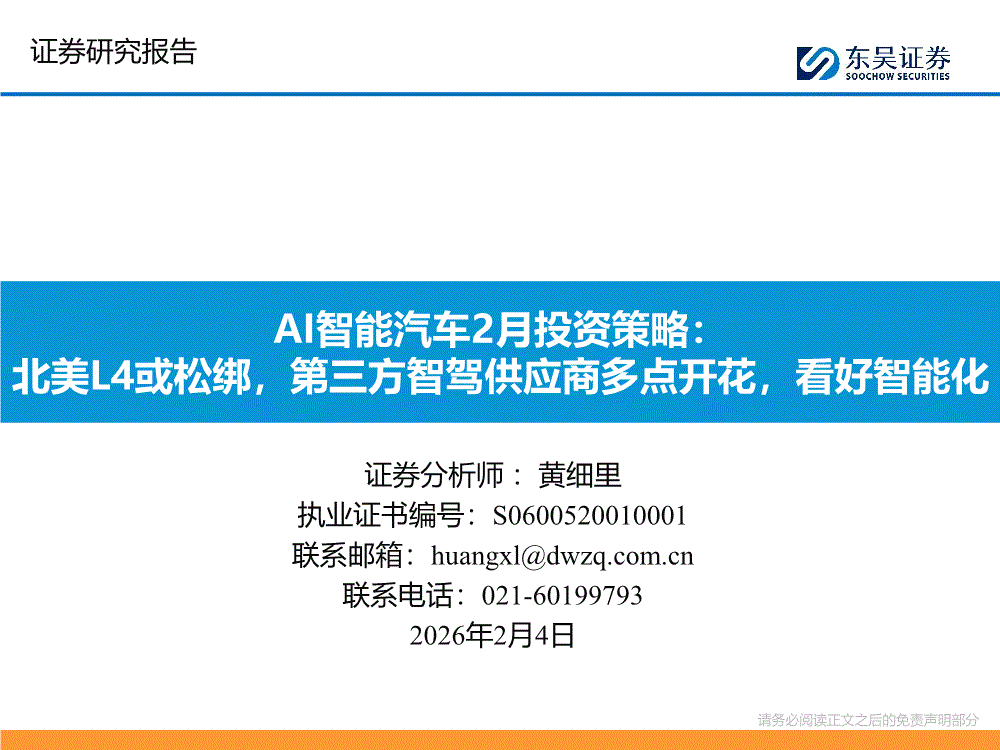 智能汽车行业:东吴证券-AI智能汽车行业2月投资策略:北美L4或松绑,第三方智驾供应商多点开花,看好智能化-260204