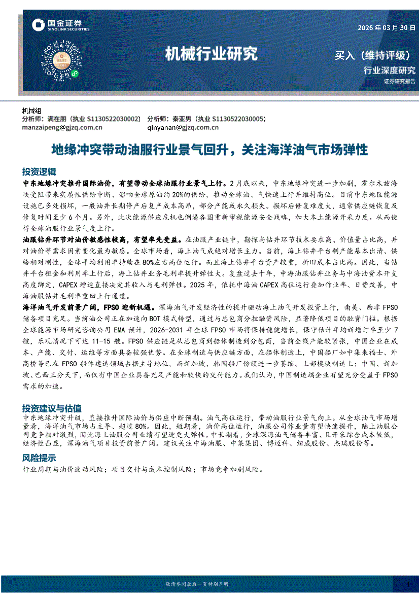 机械行业:国金证券-机械行业深度研究:地缘冲突带动油服行业景气回升,关注海洋油气市场弹性-260330