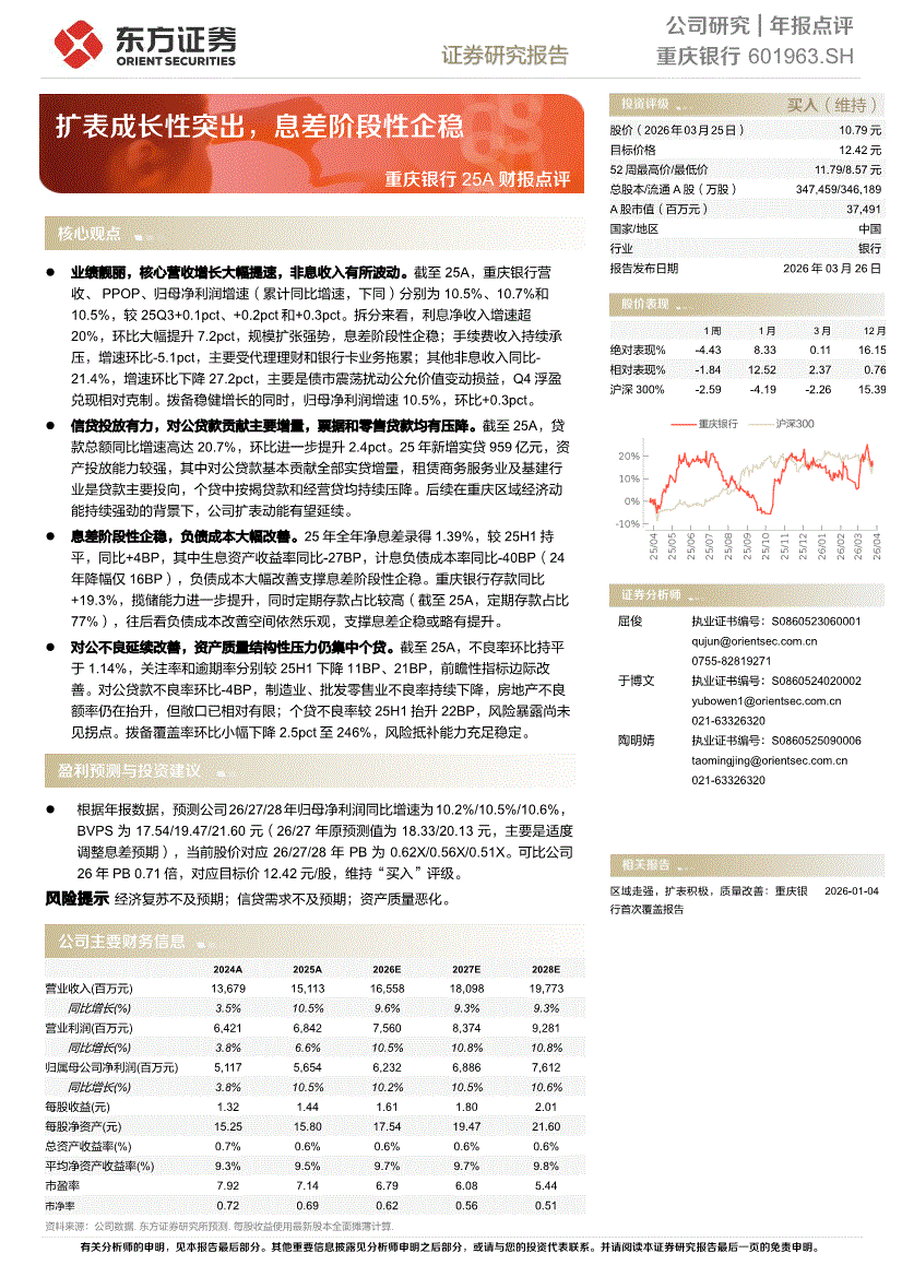 重庆银行:东方证券-重庆银行-601963-25A财报点评:扩表成长性突出,息差阶段性企稳-260326