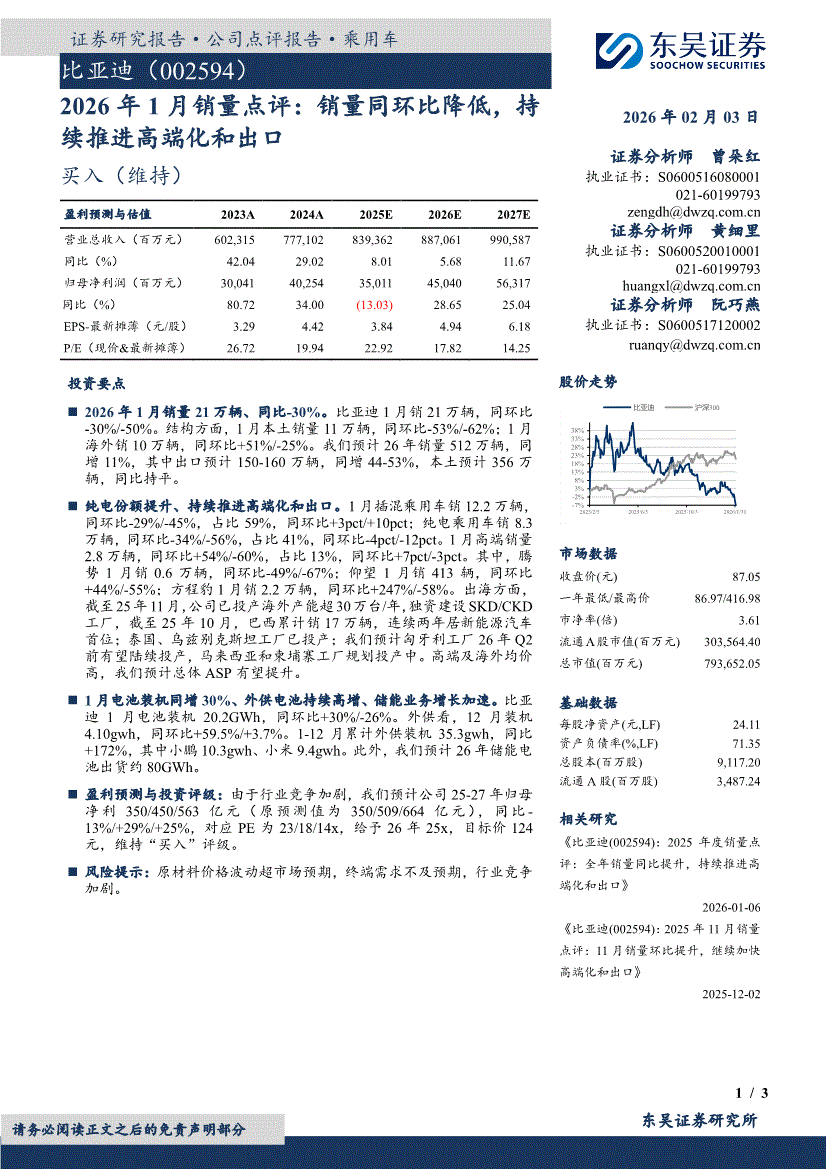 比亚迪:东吴证券-比亚迪-002594-2026年1月销量点评:销量同环比降低,持续推进高端化和出口-260203
