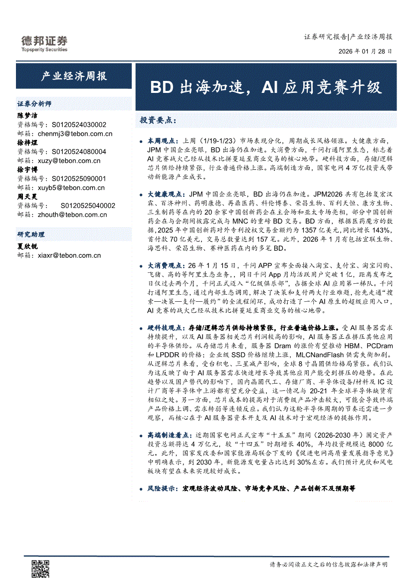 德邦证券-产业经济周报:BD出海加速,AI应用竞赛升级-260128