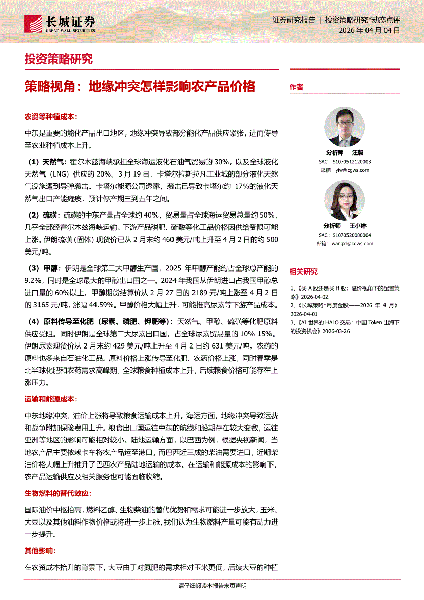 长城证券-策略视角:地缘冲突怎样影响农产品价格-260404