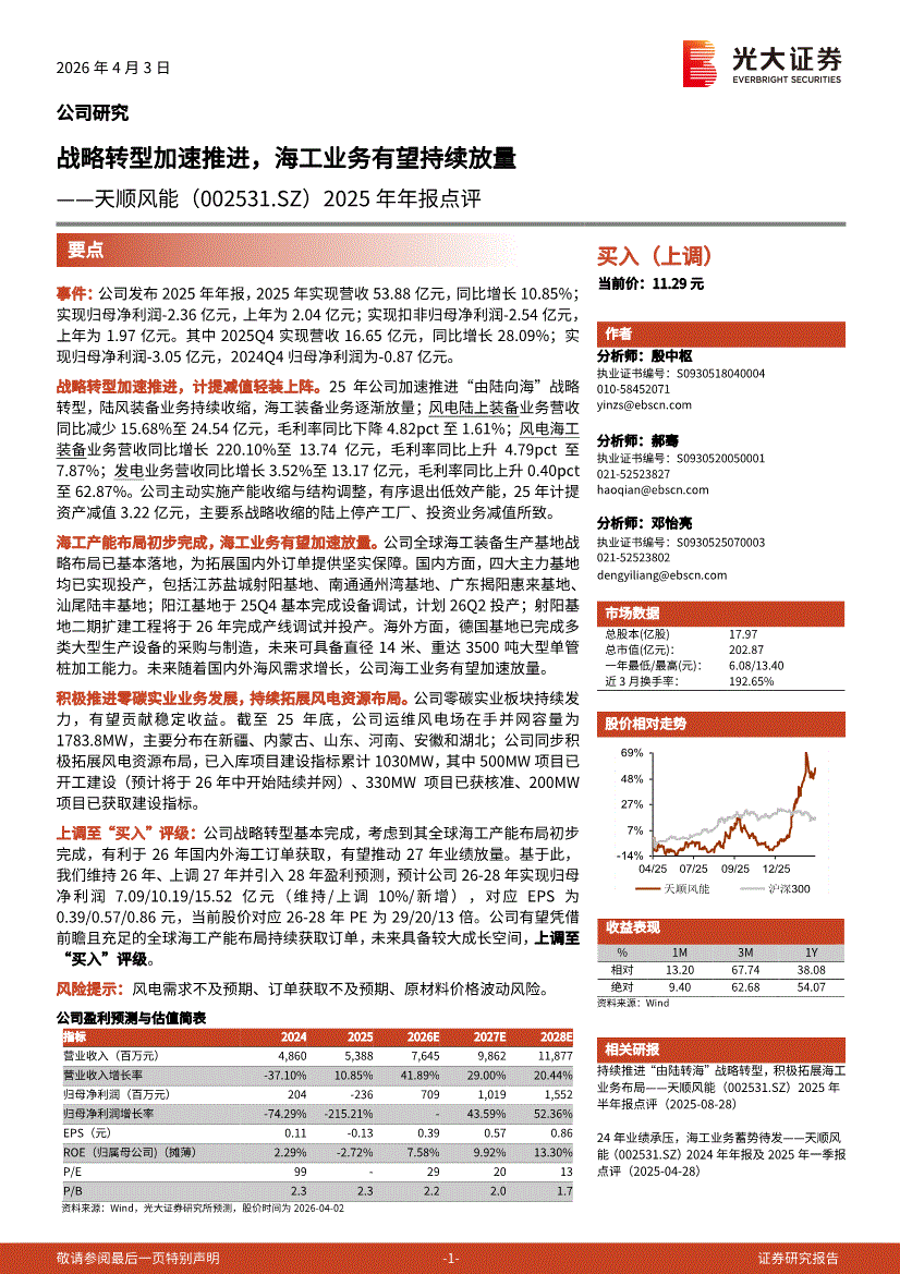 天顺风能:光大证券-天顺风能-002531-2025年年报点评:战略转型加速推进,海工业务有望持续放量-260403