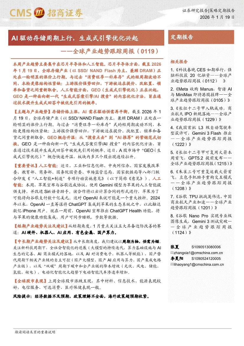 招商证券-全球产业趋势跟踪周报(0119):AI驱动存储周期上行,生成式引擎优化兴起-260119