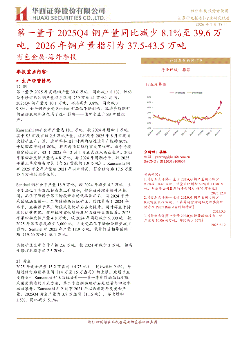 有色金属行业:华西证券-有色金属行业~海外季报:第一量子2025Q4铜产量同比减少8.1%至39.6万吨,2026年铜产量指引为37.5~43.5万吨-260119