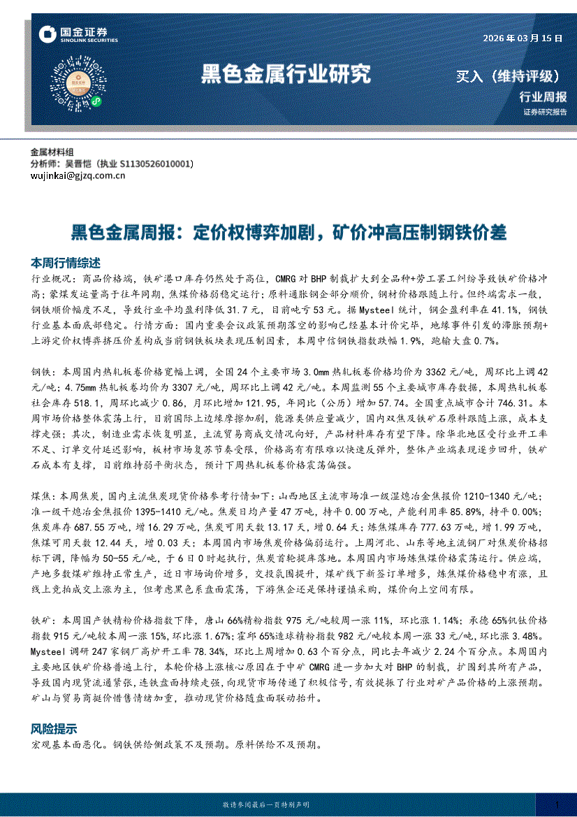 黑色金属行业:国金证券-黑色金属行业周报:定价权博弈加剧,矿价冲高压制钢铁价差-260315