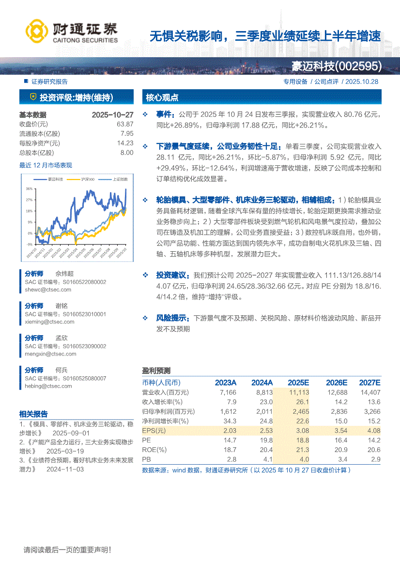 豪迈科技:财通证券-豪迈科技-002595-无惧关税影响,三季度业绩延续上半年增速-251028