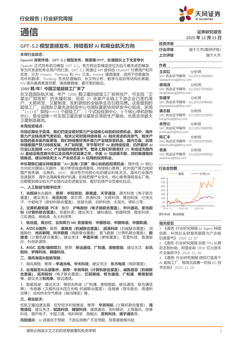 通信行业:天风证券-通信行业周报:GPT~5.2模型重磅发布,持续看好AI和商业航天方向-251215