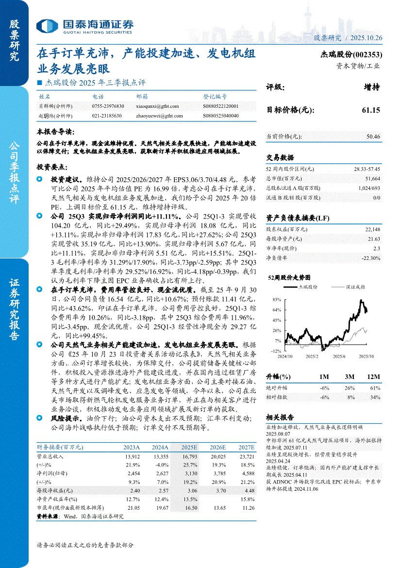 杰瑞股份:国泰海通证券-杰瑞股份-002353-2025年三季报点评:在手订单充沛,产能投建加速、发电机组业务发展亮眼-251026
