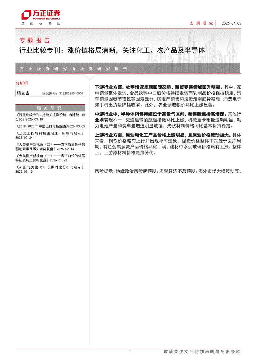 方正证券-专题报告:行业比较专刊,涨价链格局清晰,关注化工、农产品及半导体-260405