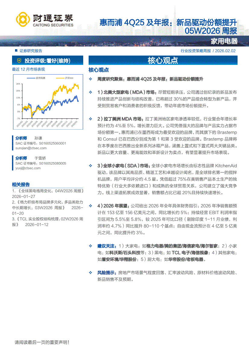 家用电器行业:财通证券-家用电器行业05W2026周报:惠而浦4Q25及年报,新品驱动份额提升-260202