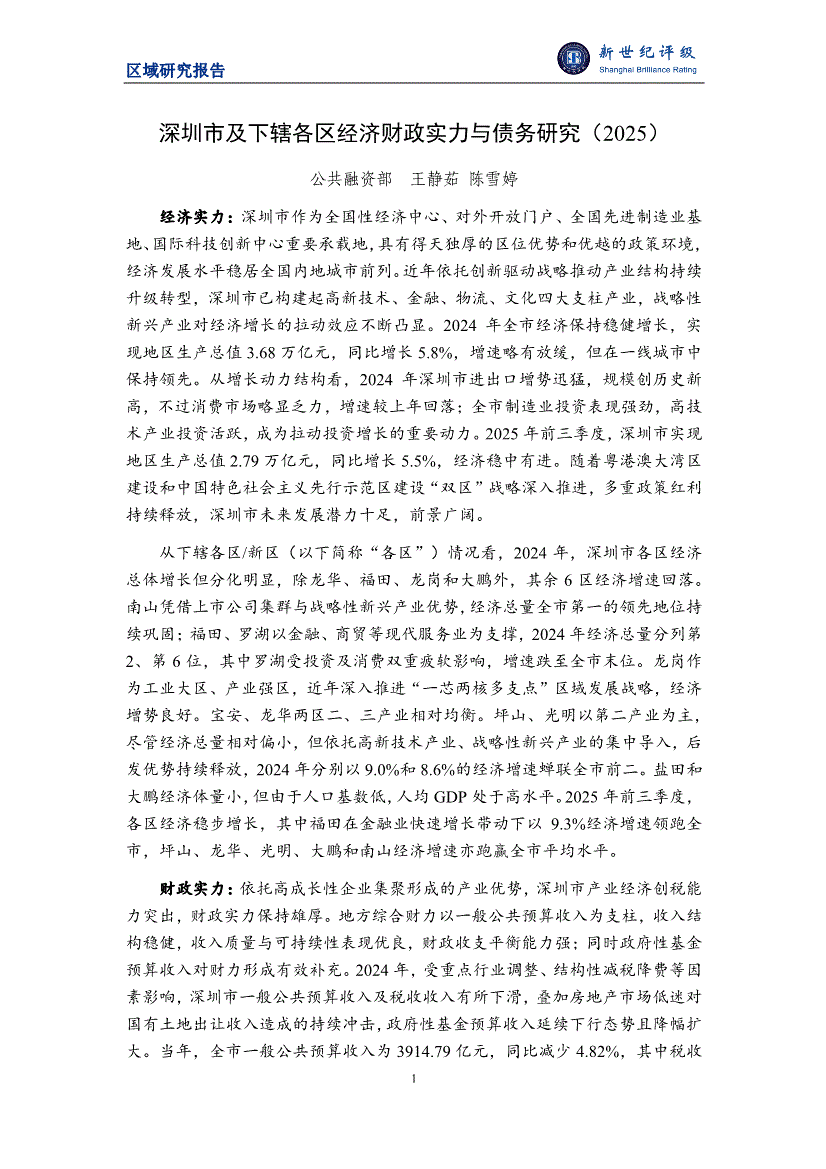 新世纪评级-深圳市及下辖各区经济财政实力与债务研究(2025)-260101