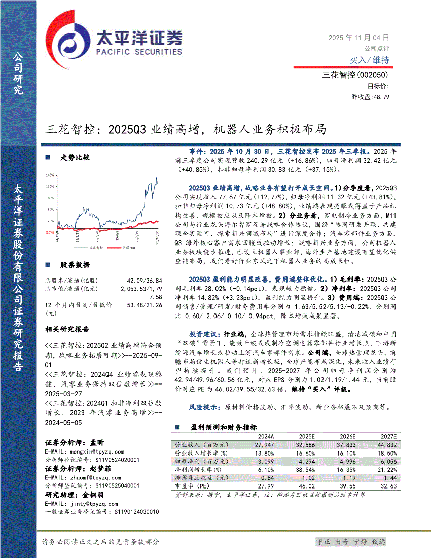 三花智控:太平洋证券-三花智控-002050-2025Q3业绩高增,机器人业务积极布局-251104
