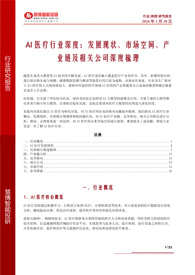 AI医疗行业:慧博智能投研-AI医疗行业深度:发展现状、市场空间、产业链及相关公司深度梳理-260130