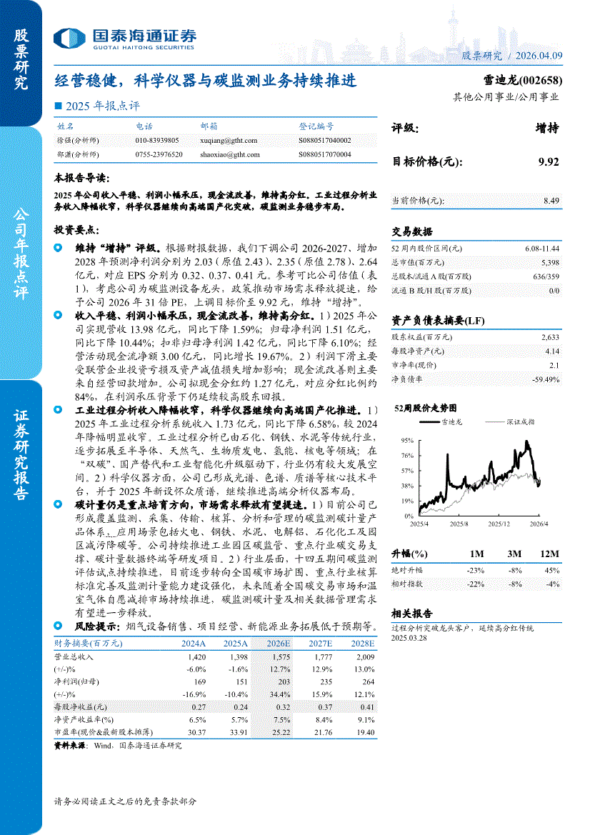 雪迪龙:国泰海通证券-雪迪龙-002658-2025年报点评:经营稳健,科学仪器与碳监测业务持续推进-260409